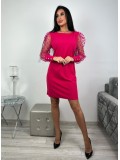 Elegancka sukienka o prostym fasonie, która sprawdzi się zarówno na co dzień, jak i na różne okazje. Rękawy wykonane z siateczki w urocze zamszowe groszki przełamują klasyczny fason oraz dodają szyku i elegancji. Jednolita kolorystyka daje wiele możliwości przy doborze ciekawych dodatków. Ten fason będzie idealnym wyborem na oficjalne spotkanie, randkę czy inną uroczystość.